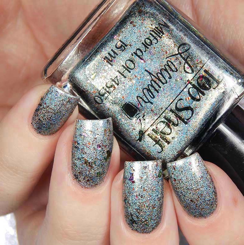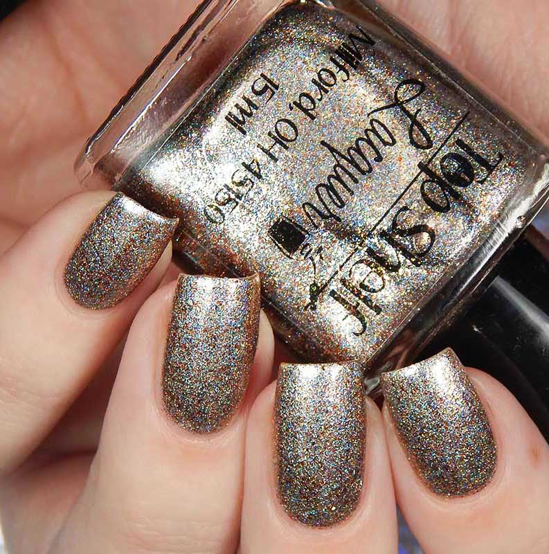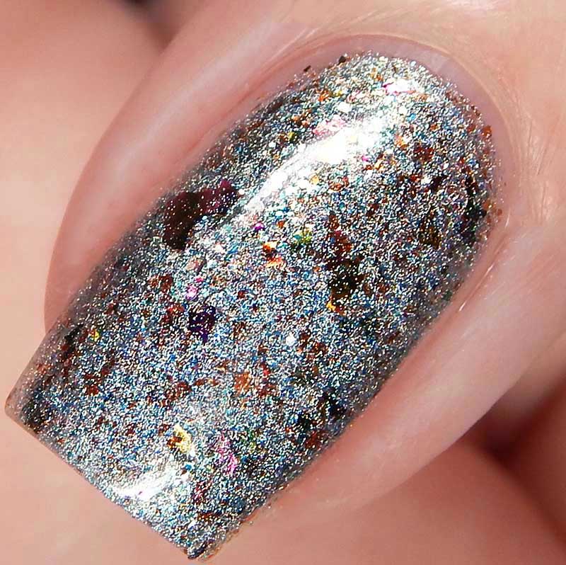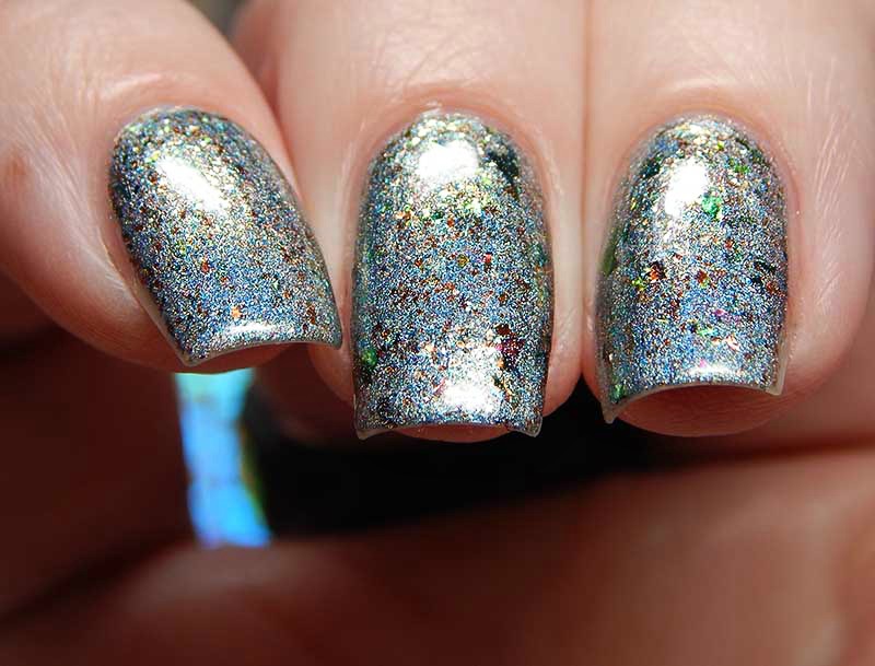 Drink Up Grinches! is a very lightly green tinted silver linear holographic with bronze flakes and multichrome pink violet to red to orange shifting flakes mixed in. I used 3 thin coats and a glossy top coat for these photos.