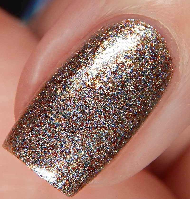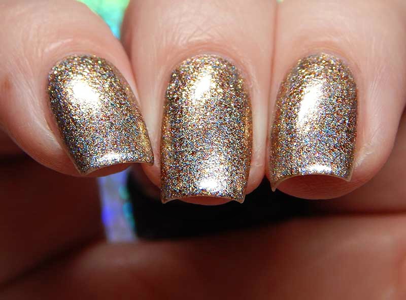 Eggnog Enthusiast is a softer metallic gold linear holographic with bronze and blue glass flecks mixed in. The blue flecks are more subtle, but you do catch them. I used 3 thin coats and a glossy top coat for these photos.
