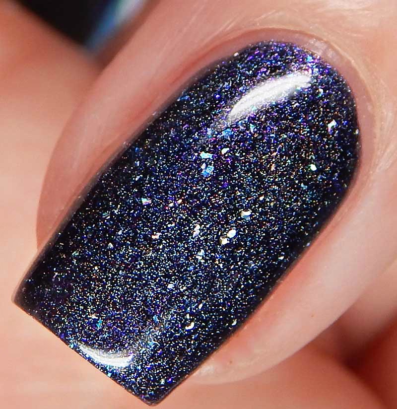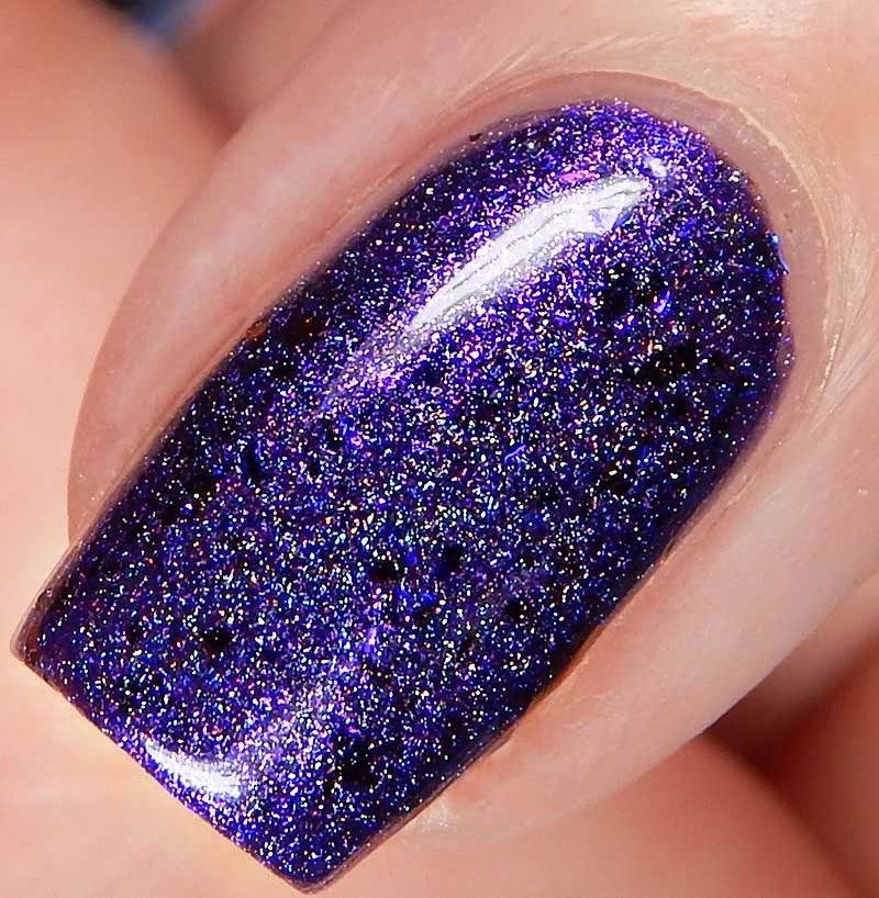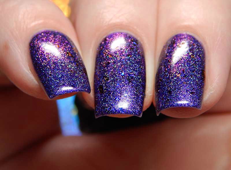 He Sees You When You’re Drinking… is a royal purple scattered holographic with navy to purple multichrome flakes and pink glass flecks. I used 3 thin coats and a glossy top coat for these photos.