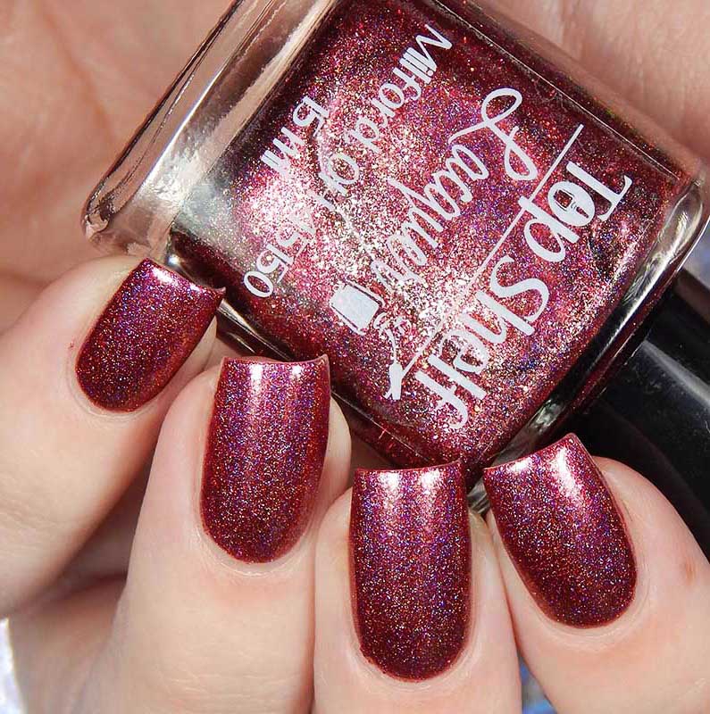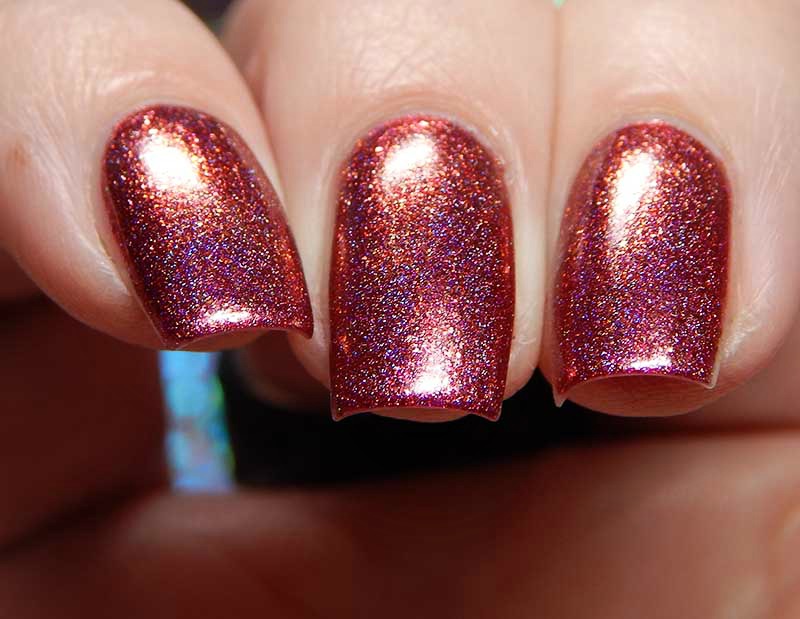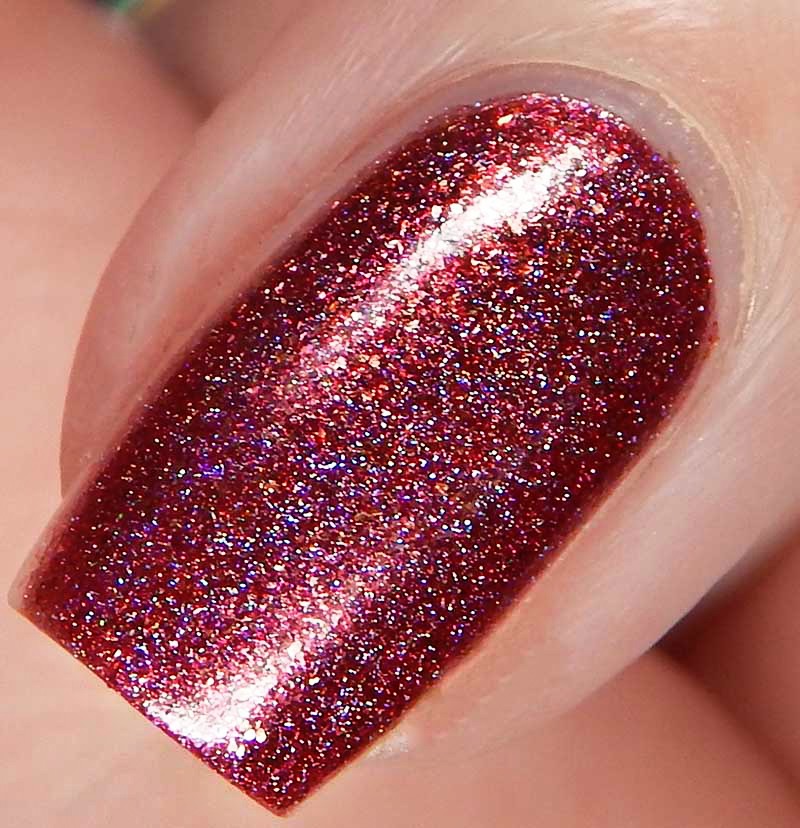 Ho! Ho! Ho! Pour The Merlot is a berry red linear holographic jelly base packed with glass flecks and bronze flakes. I used 3 thin coats and a glossy top coat for these photos.