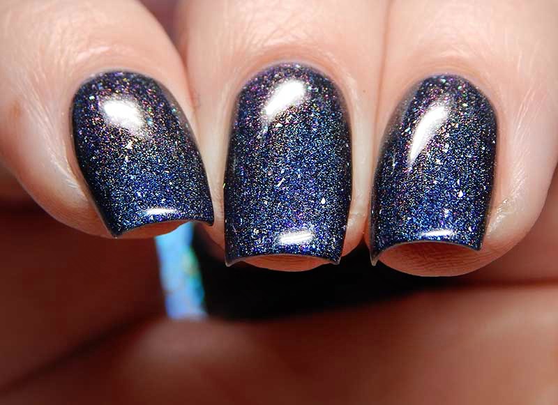 Jingle Til You Tingle is a gorgeous navy blue base with a soft fuchsia glow, a linear holographic effect and silver holo flakes mixed in. I used 2 coats and a glossy top coat for these photos.