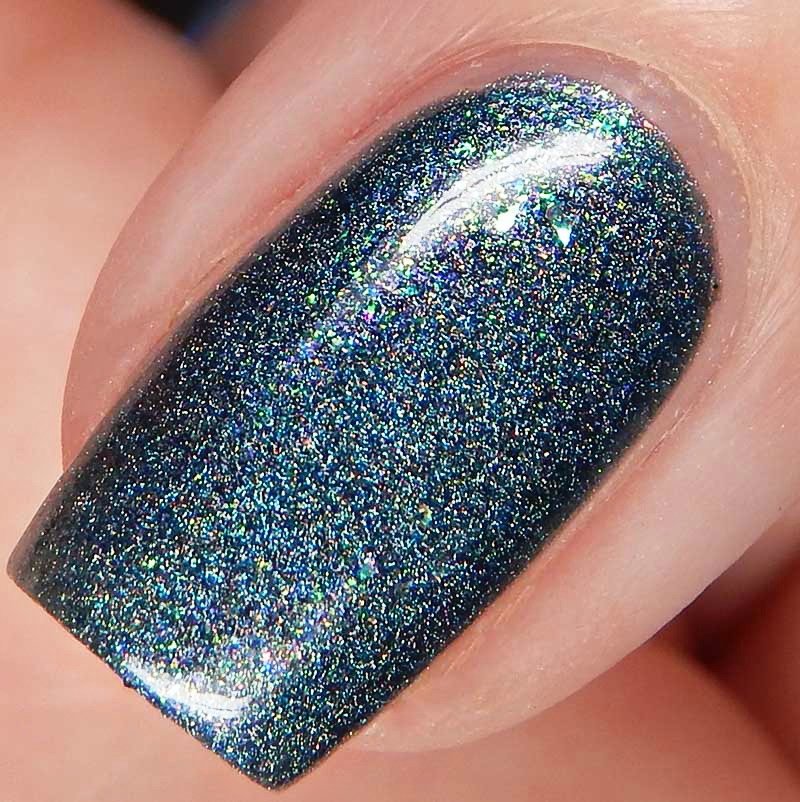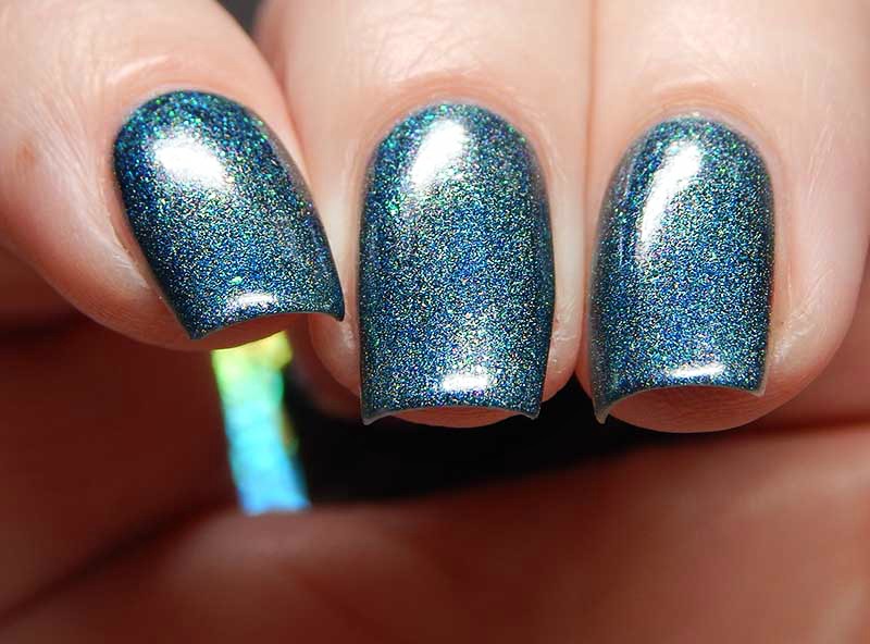 Let’s Get Elfed Up! is a dusty teal linear holographic with bright green shifty glass flecks. I used 2 coats and a glossy top coat for these photos. You can see the glass flecks spark alive in my 3 finger swatch photo!