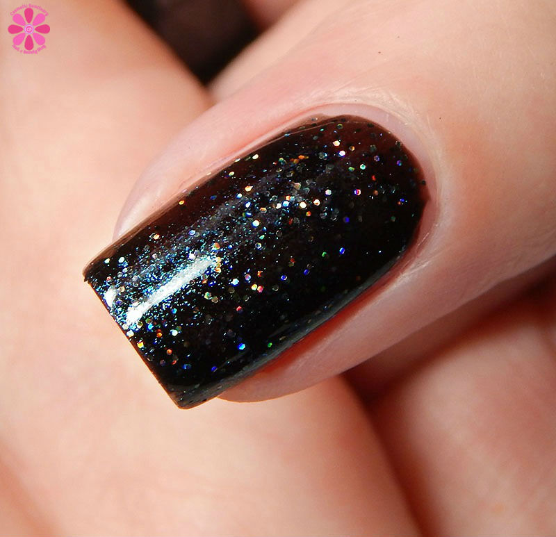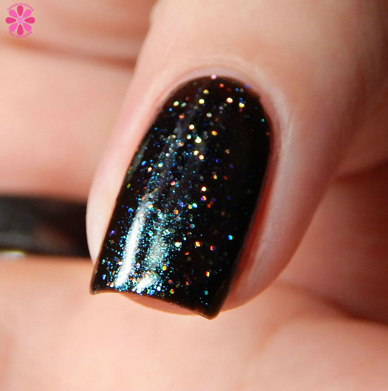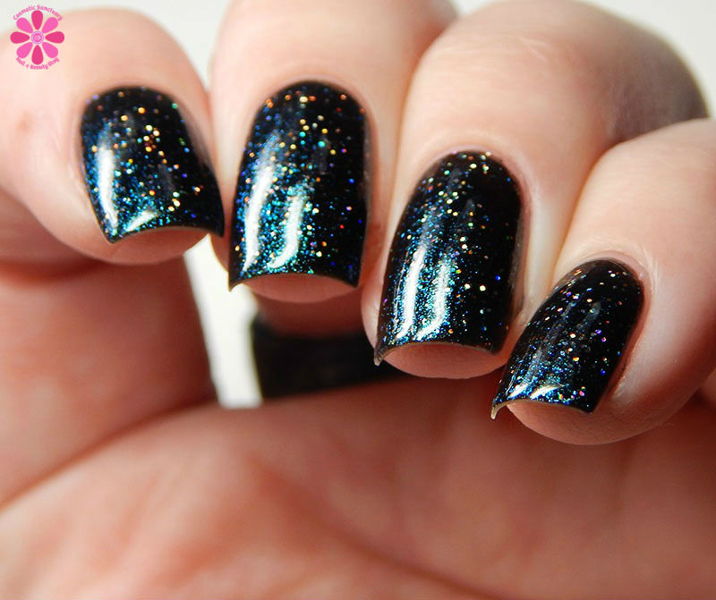 Turtle Tootsie Polishes Polish Con Blues is a black jelly holo base with silver holo micro glitter and a blue shift. I used 2 coats and a glossy top coat for these photos.