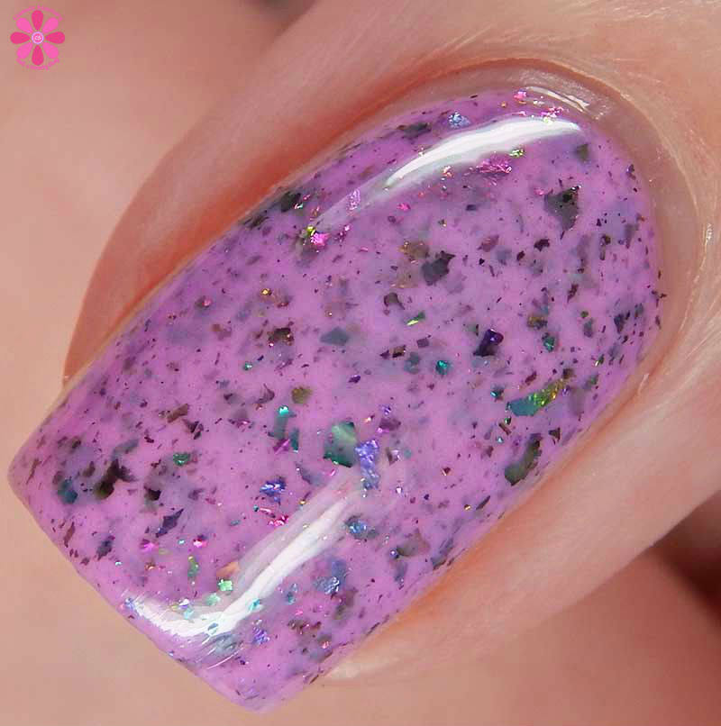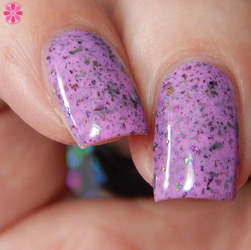 Dragon Eggs is a pink leaning orchid violet creme loaded with ultra chrome shifting flakes in pink, purple, blue and gold. I used 2 coats and a glossy top coat for these photos.