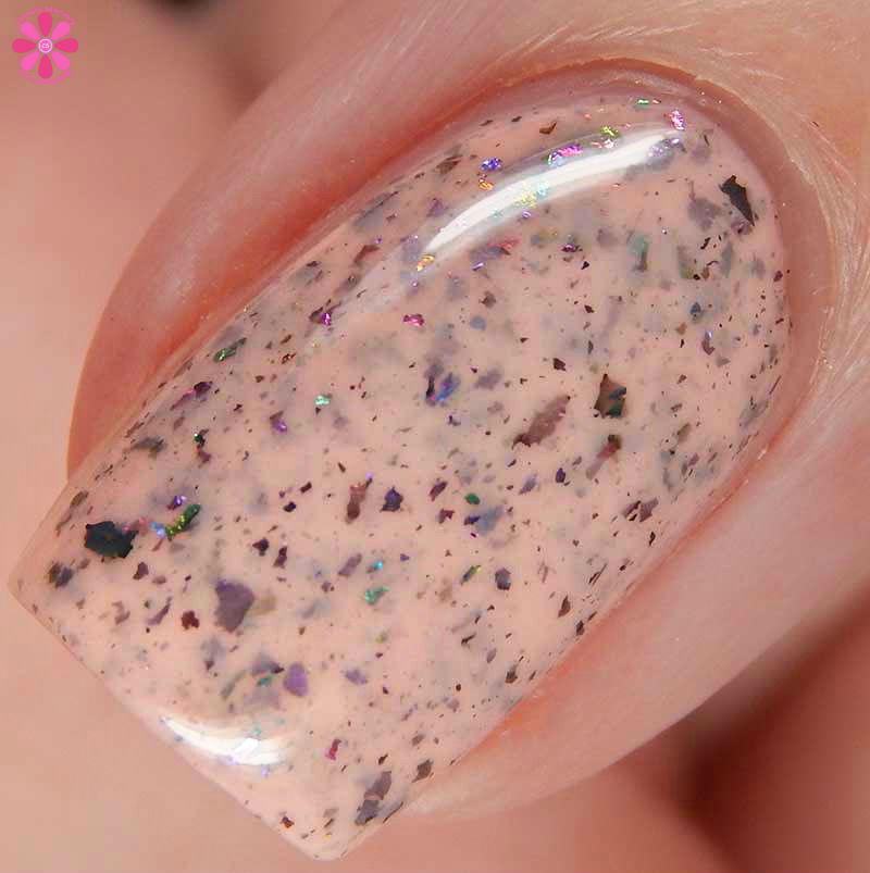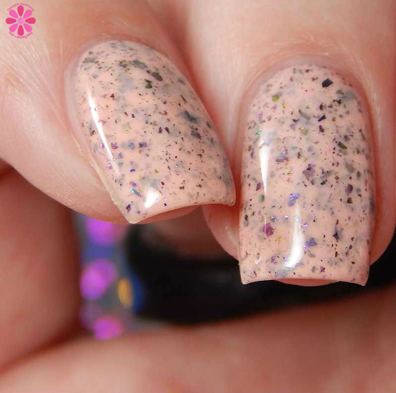 Sea Glass is a pale peachy pink neutral creme loaded with ultra chrome shifting flakes in pink, purple, blue and gold. I used 2 coats and a glossy top coat for these photos.