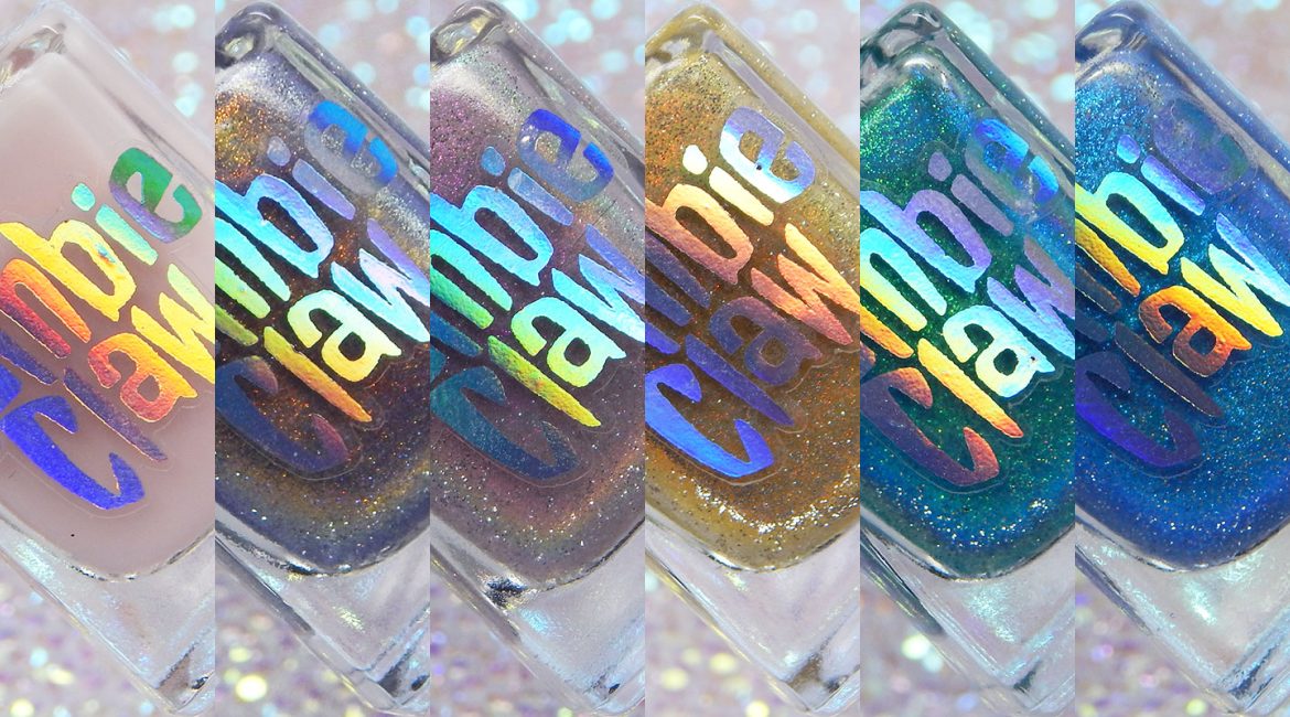 The Zombie Claw Polish Book Trope Collection is a 5 piece collection with shimmer and reflectives! The 6th shade shown is a nice sheer shade that can be worn under a polish to help with opacity or to wear alone for a nice delicate kiss of color.