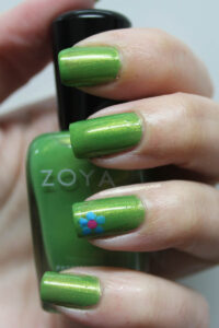 Midori is a gorgeous lighter green with gold shimmer.  It’s gorgeous and vibrant!  Perfect spring green.  Application wasn’t as great as most Zoya’s I’ve tried, it was a bit runny and pooled around the edges of my nails, but it was very easy to clean up.  Dry time was quick, each layer was done in about 4-5 minutes.